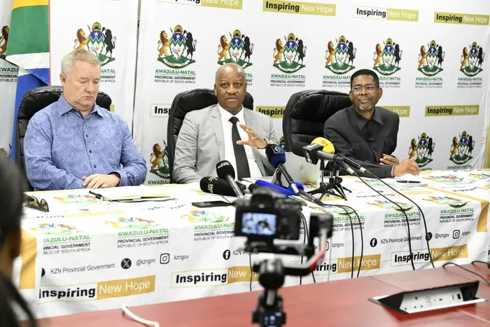 UMPHATHISWA woMnyango wezezimali uMnuz Francois Rodgers, uNdunankulu waKwaZulu-Natal uMnuz Thamsanqa Ntuli noMphathiswa woMnyango wokuThuthukisa uMnotho, ezokuVakasha nezokoNgiwa kweMvelo uMfu Musa Zondi esithangamini sabezindaba eThekwini, ngoMsombuluko