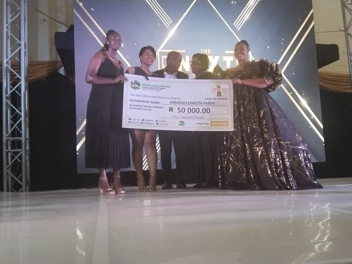 UNKSZ Noluthando Zungu wenkampani i-Amandlenkosi Farms (wesibili ngakwesokunxele) eklonyeliswa ngomklomelo omkhulu wosuku i-Top Achiever of The Year emcimbini wokuklomelisa osomabhizinisi i-The Next Billionaire Business Awards, obuse-Ugu Indoor Sports Centre, eGamalakhe, ePort Shepstone ngoLwesihlanu ebusuku