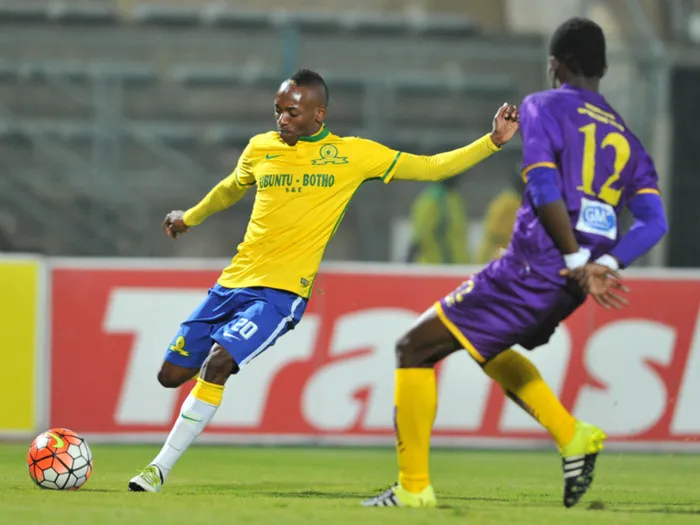 Khama Billiat of Mamelodi Sundowns challenged by Moses Sarpong of Medeama during the CAF Confederation Cup match between Mamelodi Sundowns and Medeama at the Lucas Moripe Stadium in Pretoria, South Africa on May 07, 2016 ©Samuel Shivambu/BackpagePix Khama Billiat of Mamelodi Sundowns challenged by Moses Sarpong of Medeama during the CAF Confederation Cup match between Mamelodi Sundowns and Medeama at the Lucas Moripe Stadium in Pretoria, South Africa on May 07, 2016 ©Samuel Shivambu/BackpagePix