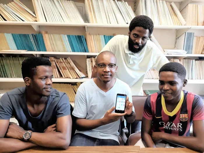 UMNUZ Lloyd Gordon (ophakathi nendawo) etshengisa izitshudeni uQondeni Ndlangamandla, (kwesokunxele), Bongumusa Gwala (kwesokudla) noNdumiso Mkhize ukuthi isebenza kanjani i-App yakhe yezibalo Isithombe: Sithunyelwe UMNUZ Lloyd Gordon (ophakathi nendawo) etshengisa izitshudeni uQondeni Ndlangamandla, (kwesokunxele), Bongumusa Gwala (kwesokudla) noNdumiso Mkhize ukuthi isebenza kanjani i-App yakhe yezibalo Isithombe: Sithunyelwe