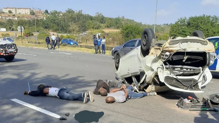 Kugcine kuboshwe abasolwa abathathu kulesi sigameko esenzeke emgwaqweni uM7 eThekwini. Kuthiwa amaphoyisa abehlola isimo kule ndawo ngesikhathi ebona imoto esolisayo, ebinabesilisa abahlanu. Amaphoyisa aveze ukuthi imoto bekubikiwe ukuthi ihamba abasolwa ngokugqekeza imizi eMalvern.