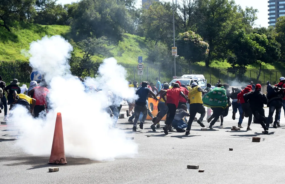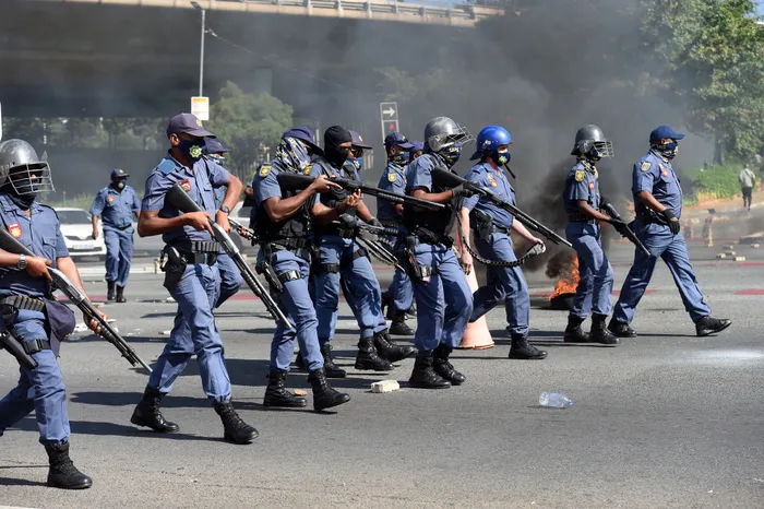 AGXEKIWE amaphoyisa avulele ngezinhlamvu zenjoloba kwashona oyedwa kubhikisha izitshudeni zaseNyuvesi iWits, izolo eGoli. Isithombe: Itumeleng English/African News Agency(ANA)