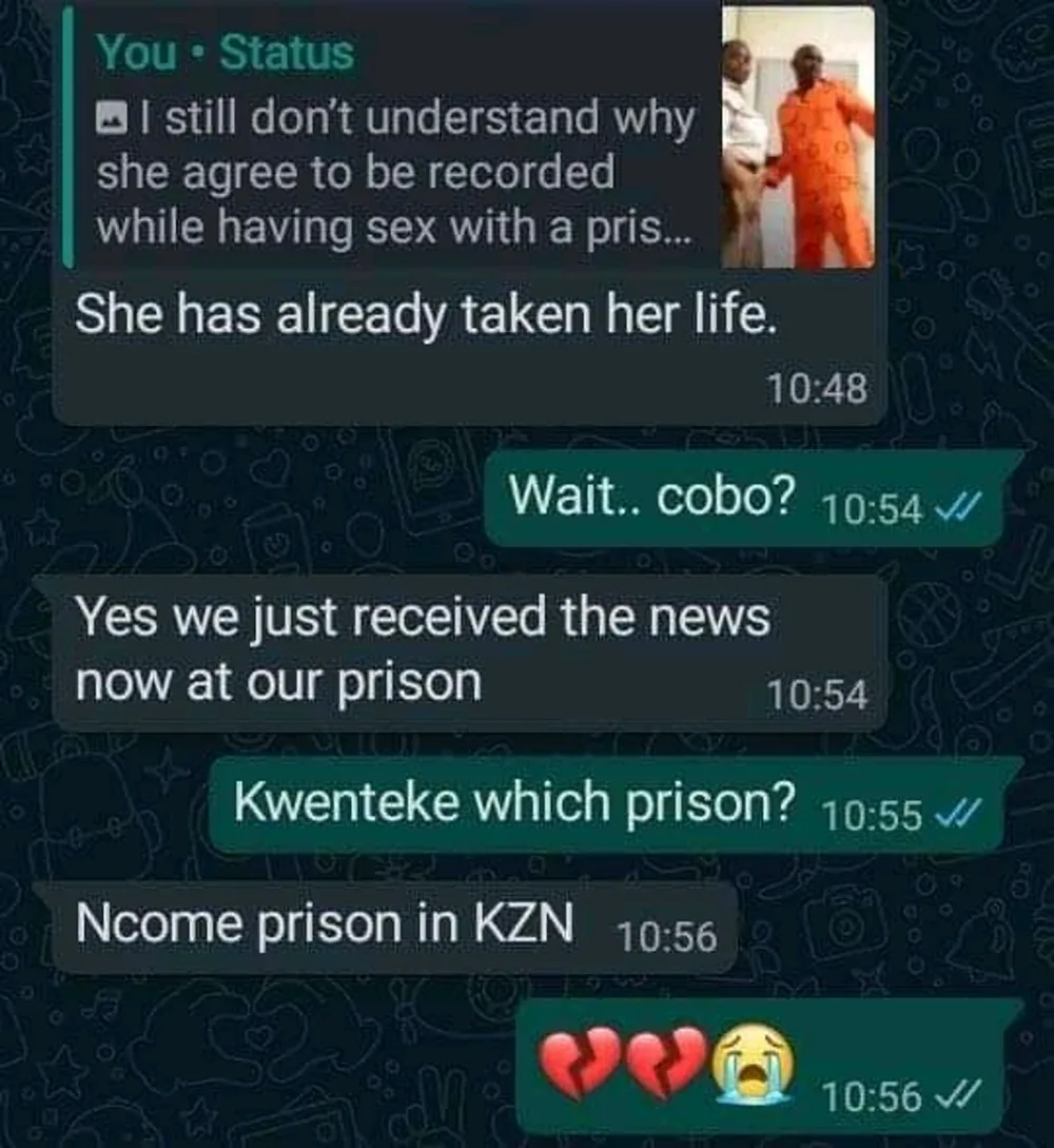 Izindaba zokuzibulala kwalo jele wesifazane ziqale ukusabalala ngenxa ye-screenshot esikhombisa ingxoxo yabathile kuWhatsApp oyedwa wabo ethi usezibulele.