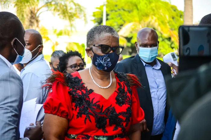 OWAYEYIMEYA yeTheku, uNkk Zandile Gumede, ephahlwe abaholi be-ANC eThekwini ngenkathi ephuma eNkantolo yeMantshi ngecala elithinta ithenda yokuqoqwa kukadoti Isithombe: Motshwari Mofokeng /African News Agency (ANA)