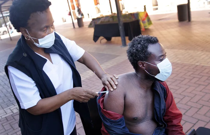 UMNUZ Xulisani Nkosi ngenkathi ethola umgomo weCovid-19, ubejovwa wu-matron Balungile Ntombela eDenis Hurley Centre, eseThekwini, Isithombe: Bongani Mbatha /African News Agency (ANA)