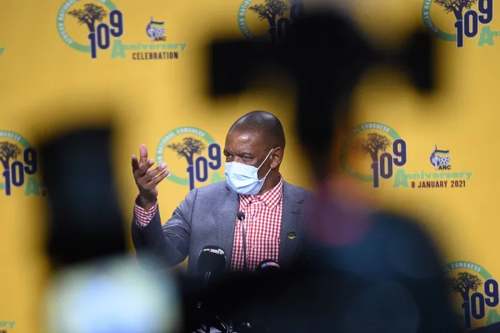UMNUZ Ace Magashule ekhuluma nabezindaba eLuthuli House ngo-Ephreli nonyaka, ngaphambi kokuthi amiswe ekusebenzeleni i-ANC njengoba esabhekene namacala. Isithombe esigciniwe: Itumeleng English/African News Agency(ANA)