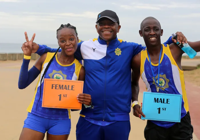 UCONSTABLE Thobeka Phungula, umkhuzi wamaphoyisa eKZN uLt General Nhlanhla Mkhwanazi, uConstable Siphamandla Khambule, emqhudelwaneni wokugijima eBlue Lagoon eThekwini, lapho bekugqugquzelwa umkhankaso wokulwa nokuhlukunyezwa kwabesifazane nezingane Isithombe: Nqobile Mbonambi