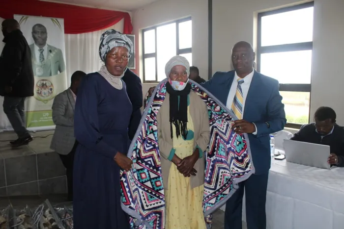 UMNUZ Comfort Khumalo nesinye isikhulu sikamasipala benikelela omunye wogogo ngengubo yokulala Isithombe:SITHUNYELWE