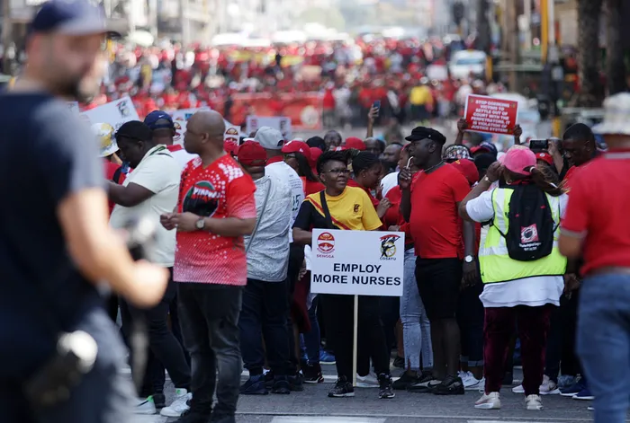 IZINKULUNGWANE zabamashi zivale umgwaqo osenkabeni yedolobha iTheku, kudluliswa uhlu lwezikhalo kuhulumeni, izolo Isithombe: BONGANI MBATHA: African News Agency /ANA