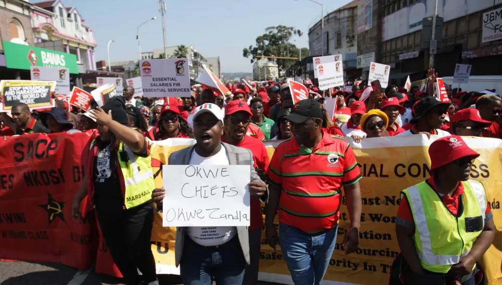 Kume nse ukuhamba kwezimoto enkabeni yedolobha iTheku, izinkulungwane zabantu iningi labo ebezigqoke imifaniswano yezinyunyana ezingaphansi kwe-Cosatu, zigcwele isitaladi uPixely kaSeme, zimasha.