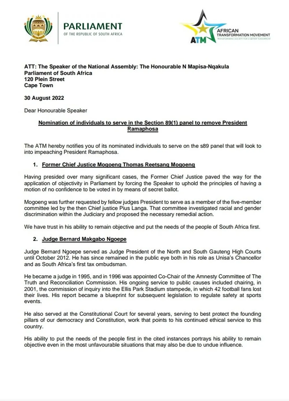 Namuhla, iqembu i-ATM libhalele uSomlomo wePhalemende, lwathumela uhlu lwamagama abantu olufuna babe yingxenye kaSection 89 (1) wokuqumba phansi umengameli.