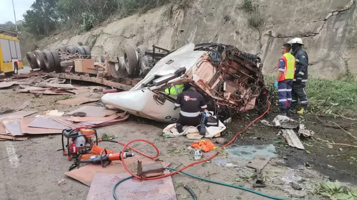 USINDE kukubi umshayeli weloli eliginqike nomthwalo ngoMsobuluko ntambama emgwaqweni uM7 eThekwini Isithombe: Netcare 911