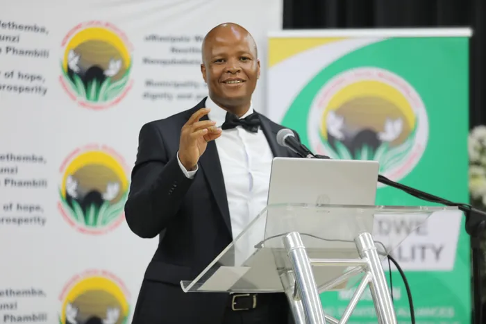 IMEYA kaMasipala waseNdwedwe, ikhansela uSam Mfeka, ikhuluma nosomabhizinisi bendawo emcimbini wabo Isithombe: NQOBILE MBONAMBI