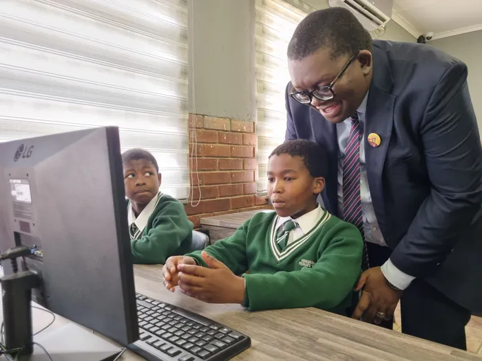 IMEYA yaseZululand uMnuz Thulasizwe Buthelezi ekhonjiswa nguHawu Mathabela noQuinton Langa asebekwazi ukukwenza ngekhompyutha Isithombe : BONGIWE ZUMA