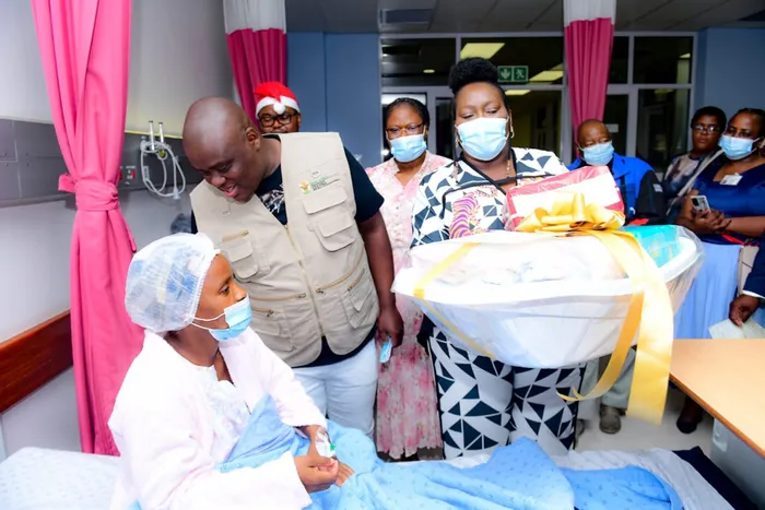 UNGQONGQOSHE wezeMpilo KwaZulu-Natal, uNksz Nomagugu Simelane nephini likaNgqongqoshe woMnyango wezaseKhaya, uMnuz Njabulo Nzuza bepha izingane ezizalwe ngoKhisimusi izipho esibhedlela iGeneral Gizenga Mpanza, KwaDukuza ngosuku lukaKhisimusi Isithombe: SITHUNYELWE