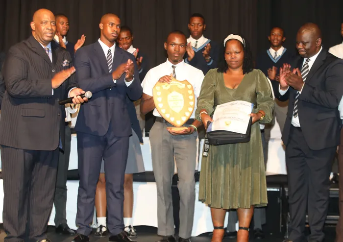 KUSUKELA kwesokunxele nguMntwana uQedi Zulu, uSolwazi Zulu, uSiyabonga Mchunu obaqwaqwade bonke, uNkk Xolile Chiliza Mchunu (unina womfundi) noSihlalo wesigungu sesikole uMnuz uPrince Bhengu Isithombe : NQOBILE MBONAMBI/ AFRICAN NEWS AGENCY (ANA)