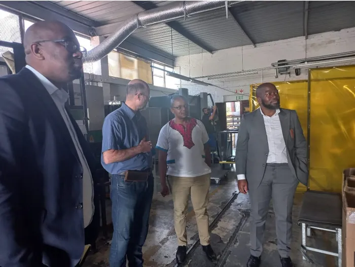 UKhomishana we-UIF uMnuz Teboho Maruping, (ophakathi nendawo, uthathwe exoxa noDkt Christiaan Bosch oyiManaging Director eRickard Air Diffusion. Lapha bathathwe nabacwaningi mabhuku Isithombe:UIF