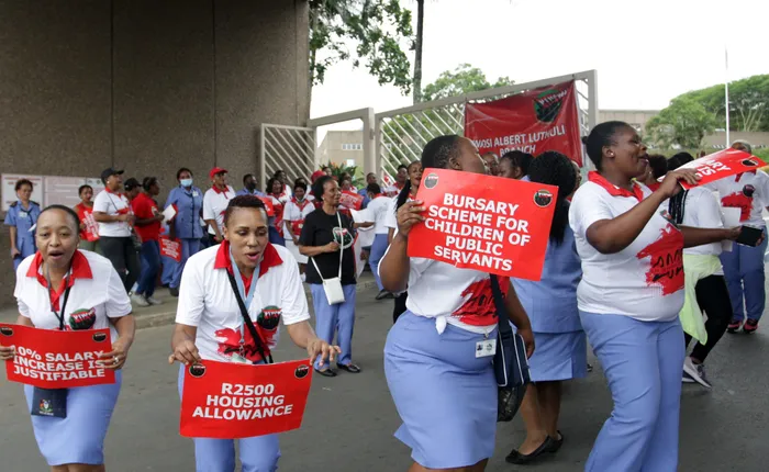 ABASEBENZI benyunyana iNational Health and Allied Workers Union bebhikisha ngaphambi kwesibhedlela iPrince Mshiyeni Memorial ISITHOMBE: Bongani Mbatha: African News Agency /ANA