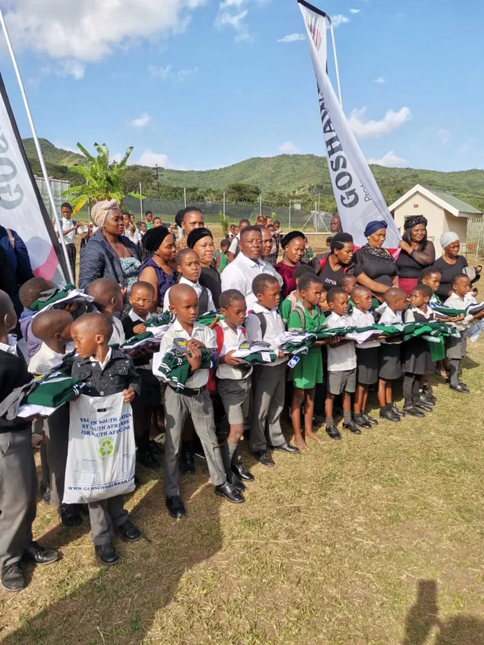 UNgcobo usanda kunikela ngomfaniswano wesikole kubo bonke abafundi bakwaGrade 1 eMnawe Primary, okuyisikole asakha ngephakethe lakhe ngo-1998.