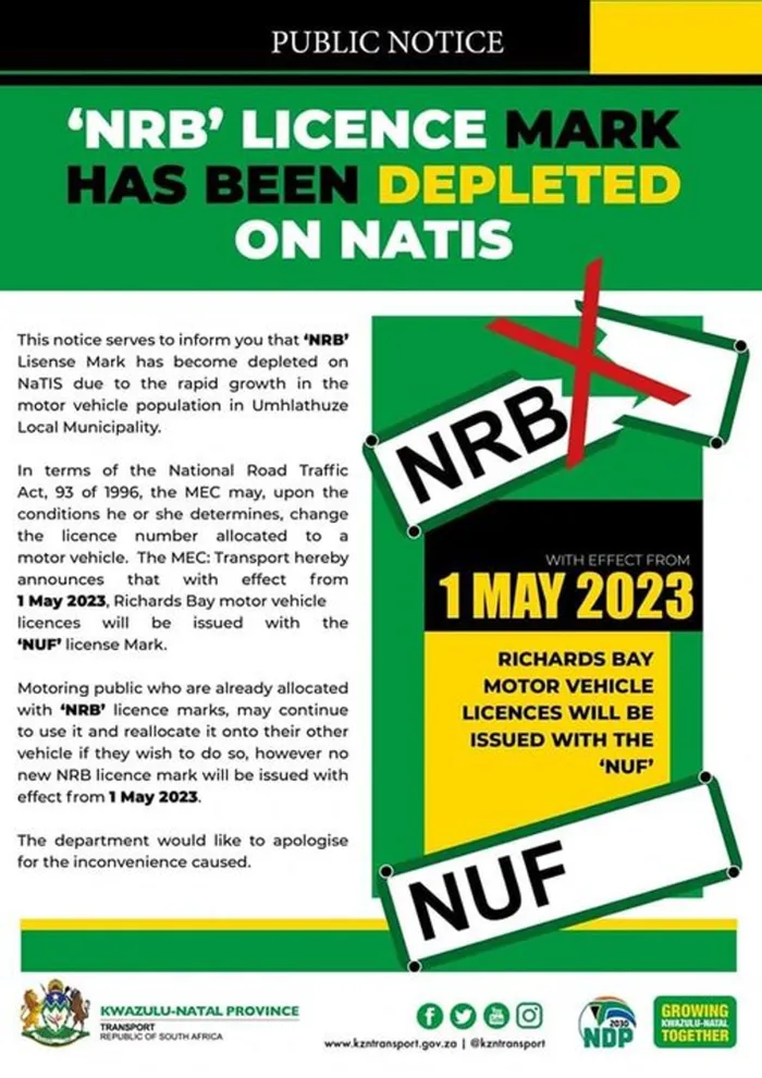 UMnyango wezokuThutha KwaZulu-Natal, ufake isaziso sokuthi kusukela izolo, le nombolo yemoto ngeke isasebenza kodwa abebevele benayo bazoqhubeka bayisebenzisa kodwa abafuna ukubhalisa izimoto zabo ezintsha ngeNRB ngeke besavumeleka ngoba isibalo sesifinyelele ekugcineni.