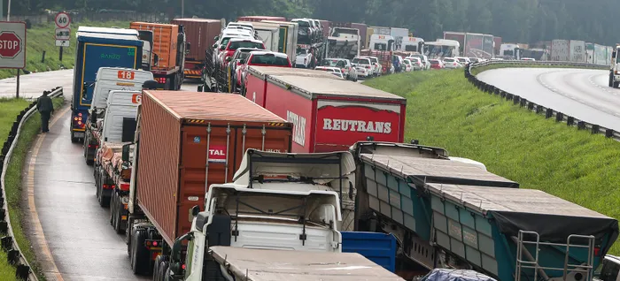 ABAYIVALILE imigwaqo kulokhu abashayeli bamaloli njengoba betelekela ukuqashwa kwabokufika. Amaloli ayepakwe kuN3 eVan Reenens Pass kwesinye isiteleka Isithombe:LEON LESTRADE /AFRICA NEWS AGENCY/ANA