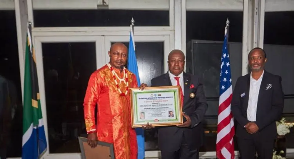 UMNUZ Bryce Mthimkhulu III emukela umklomelo wokuba yiNxusa lenhlangano engaphansi kwe-United Nations, i-International Association of World Peace Advocates kuMnuz Anthony Chinedum emcimbini obuseMahlutshini, eShowe