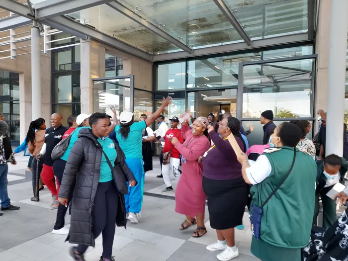 INGXENYE yabasebenzi bePublic Servants Association (PSA) bemasha esibhedlela, iDkt Pixley ka-Isaka Seme Memorial, izolo, bekhala ngokuhlukunyezwa umphakathi nabaphathi babo bakulesi sibhedlela Isithombe: PHILI MJOLI
