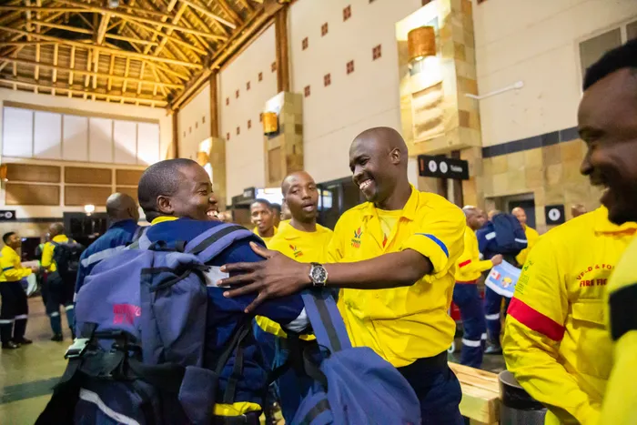 BEKUNGUBUMNANDI bodwa esikhumulweni sezindiza iKruger National kwamukelwa abezicishamlilo ebebeyolekelela ezweni laseCanada kusha amahlathi isithombe: SITHUNYELWE