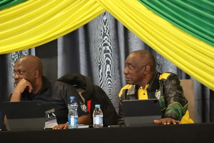 UMENGAMELI we-ANC uMnuz Cyril Ramaphosa noNdunankulu waseGauteng uMnuz Panyaza Lesufi bese mhlanganweni wegatsha leGreater Joburg ngoMgqibelo isithombe: @myANC/twitter