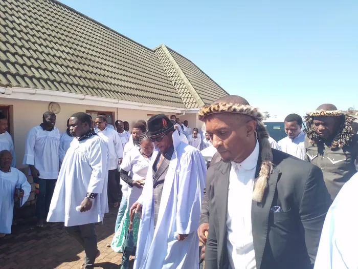 UNYAZILWEZULU, umholi wamaNazaretha ohlangothini lwaseBuhleni, uMnuz Mduduzi Shembe, amukelwa yinkosi uSibonelo Mkhize, noDkt Zweli Mkhize, izolo ngesikhathi luhambele kwaMkhize Isithombe: SABELO NSELE