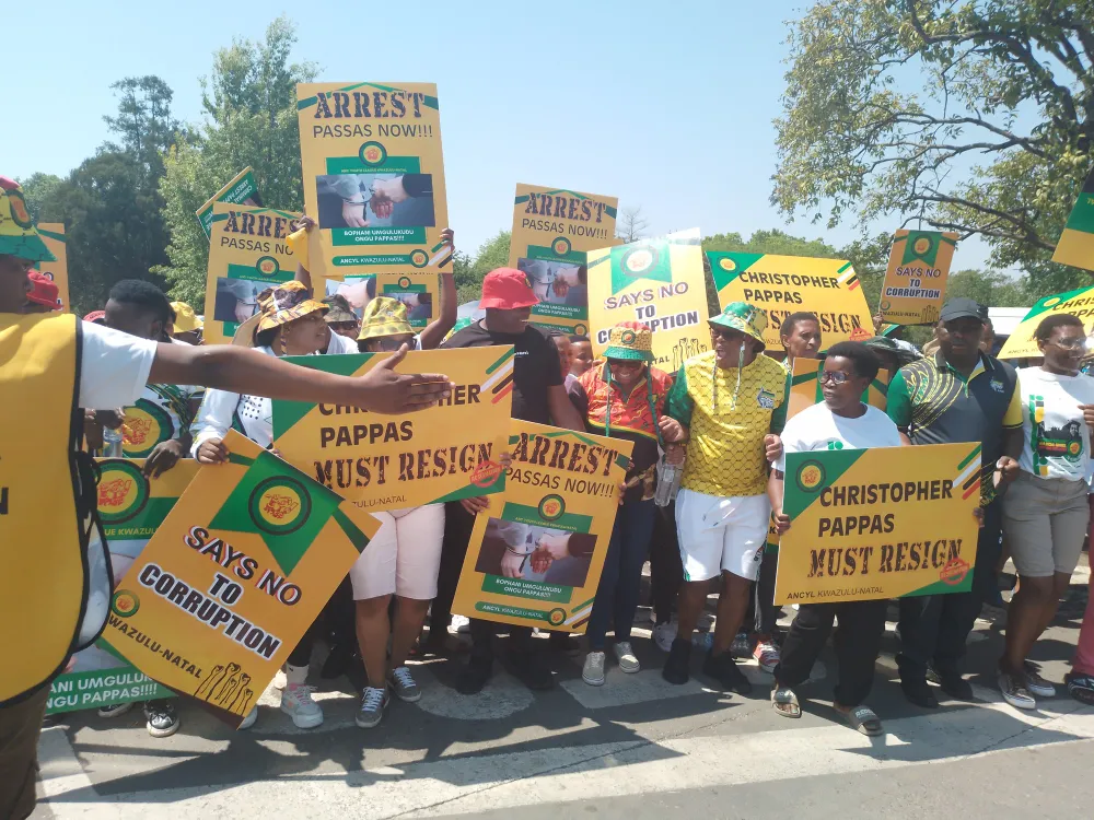 Ukusho lokhu ngesikhathi kunombhikisho we-ANCYL emahhovisi oMasipala waseMngeni, lapho khona bebefuna ukuba uPappas ehle esikhundleni.