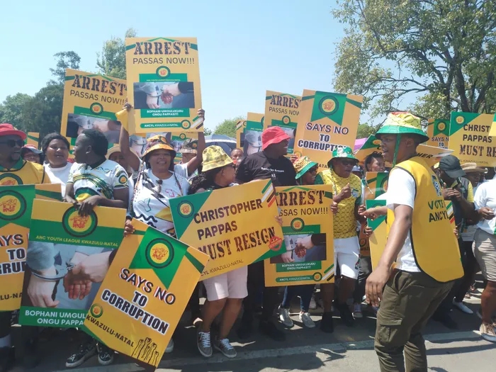 AMALUNGU e-ANCYL KwaZulu-Natal abe nombhikisho emahhovisi oMasipala waseMngeni, lapho ayalele ukuba yehle esikhundleni imeya yalo masipala, uMnuz Chris Pappas, ayisola ngenkohlakalo Isithombe: SABELO NSELE