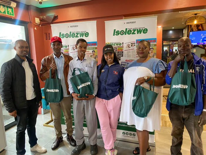 ABAFUNDI beSolezwe abawine emncintiswaneni wokuyodla eMojo’s Shisanyama & Carwash baphinde bahlomula ngezipho. Kusuka kwesokunxele ngumhleli weSolezwe uThulani Mbatha, Skhumbuzo Mkhize, Thami Mbhele, imenenja yaseMojo’s uZanele Khumalo, Giba Mkhize noSakhephi Mdima Isithombe: FANELESIBONGE BENGU