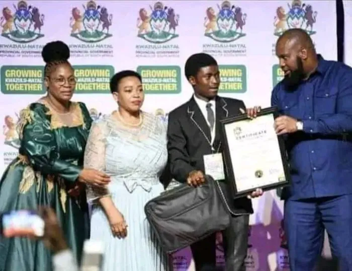 LESI esinye sezigameko esasusa ukukhuluma lapho kwabonakala uNgqongqoshe wezeMfundo KwaZulu-Natal, uNkk Mbali Frazer noNdunankulu waKwaZulu-Natal, uNkk Nomusa Dube-Ncube, bebukela ngesikhathi uNgqongqoshe wezokuThuthukiswa koMnotho, uMnuz Siboniso Duma, eklomelisa umfundi webanga leshumi owayenze kahle Isithombe: Facebook
