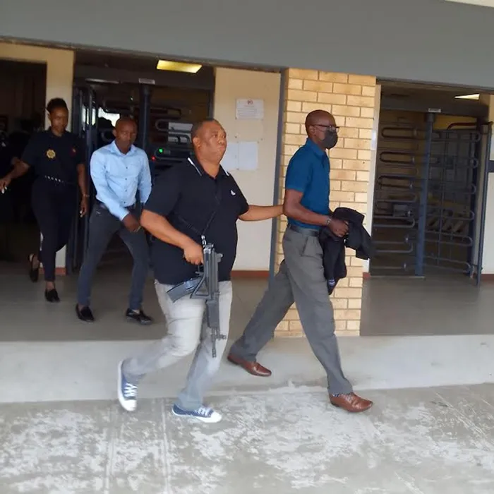 UBEQASHWE ngelokhozi uthishanhloko, uMnuz Justice Khumalo, ngesikhathi efika eNkantolo yeMantshi yaseMlaza, izolo Izithombe: NKOSIKHONA CELE