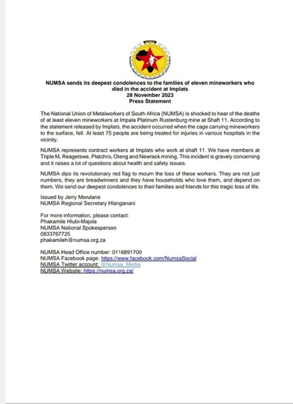 Inyunyana yabasebenzi abasebenza ngensimbi i-Numsa idlulise amazwi enduduzo emindenini yabavukuzi abadlule emhlabeni kulesi sibhicongo. I-Numsa imele abasebenzi benkontileka ku-shaft 11 lapho kwenzeke khona isigameko.
