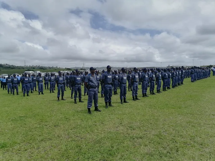 Amaphoyisa eviliyela eMargate namuhla ngesikhathi uNgqongqoshe wamaPhoyisa uMnuz Bheki Cele ehambele izindawo ezisoGwini oluseNingizimu ehlola ezokuphepha njengoba kuyisikhathi samaholidi Isithombe: SAPS