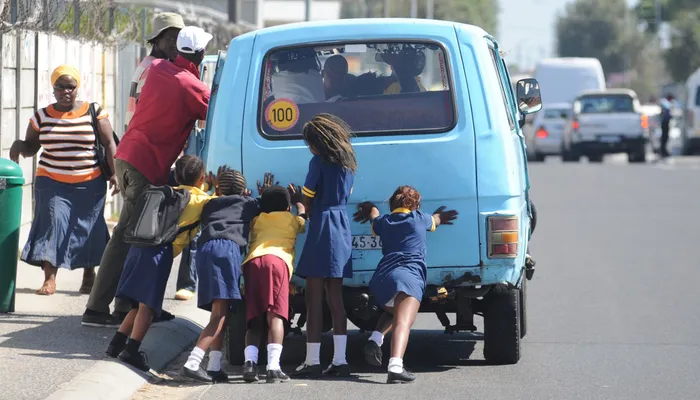 Abafundi besiza ukuphusha imoto ebahambisa esikoleni Isithombe: Sigcinwe