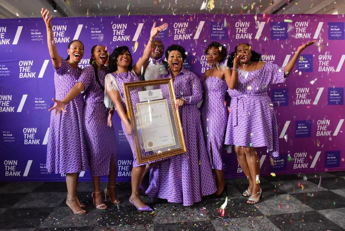 INJABULO ibibhalwe ebusweni emalungwini eYWBN Mutual Bank ngesikhathi ethula ngokusemthethweni ilayisensi yawo yokusebenza njengebhange ayisebenzele iminyaka Isithombe:KAGISO LEGOTLO