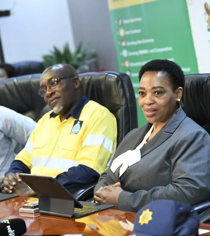 IMEYA yeTheku uMnuz Mxolisi Kaunda noNdunankulu waKwaZulu-Natal, uNkk Nomusa Dube-Ncube bekhuluma esithangamini nabezindaba ebesiyizolo Isithombe: SITHUNYELWE