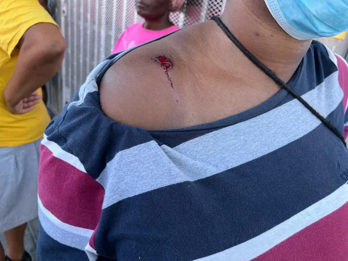 Kulokhu kungqubuzana phakathi kwamaphoyisa nalaba besifazane, ababili badubulekile. Omunye udubuleke ehlombe kwathi omunye wadubuleka ezinqeni ngesikhathi amaphoyisa ehlakaza isixuku.