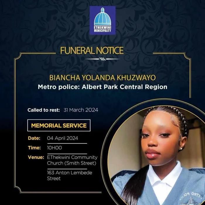 Kulesi sigameko kufe uNksz Yolanda Bianca Khuzwayo (23) waseGlenmore, kwaboshwa uMnuz Sizwe Ngema (27). Bobabili bebengamaphoyisa kaMasipala weTheku.