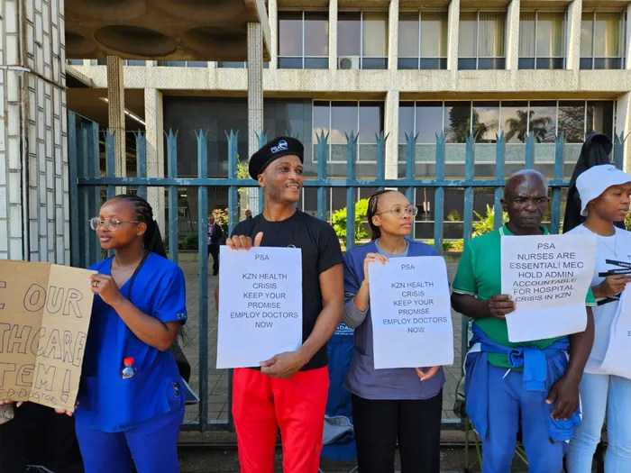 INYUNYANA yabasebenzi iPublic Servants Association SA eyeseka odokotela abaphothule izifundo zabo abangaqashiwe, abaqhinqe ngaphandle kwebhilidi elinehhovisi likaMphathiswa wezeMpilo KwaZulu-Natal, uNksz Nomagugu Simelane iNatalia Bulding eMgungundlovu, ijoyine labo dokotela ebebebhikisha ngaphambi kwaleli hhovisi izolo ISITHOMBE: SITHUNYELWE