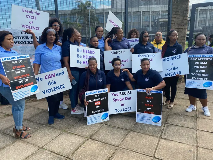 ABENHLANGANO engenzinzuzo esiza abantu ngokwelulekwa ngokomqondo, iLifeLine ibibhikisha ngaphandle kwenkantolo ukweseka umndeni kamufi, uConstable Bianca Khuzwayo Isithombe: ZIMBILI VILAKAZI