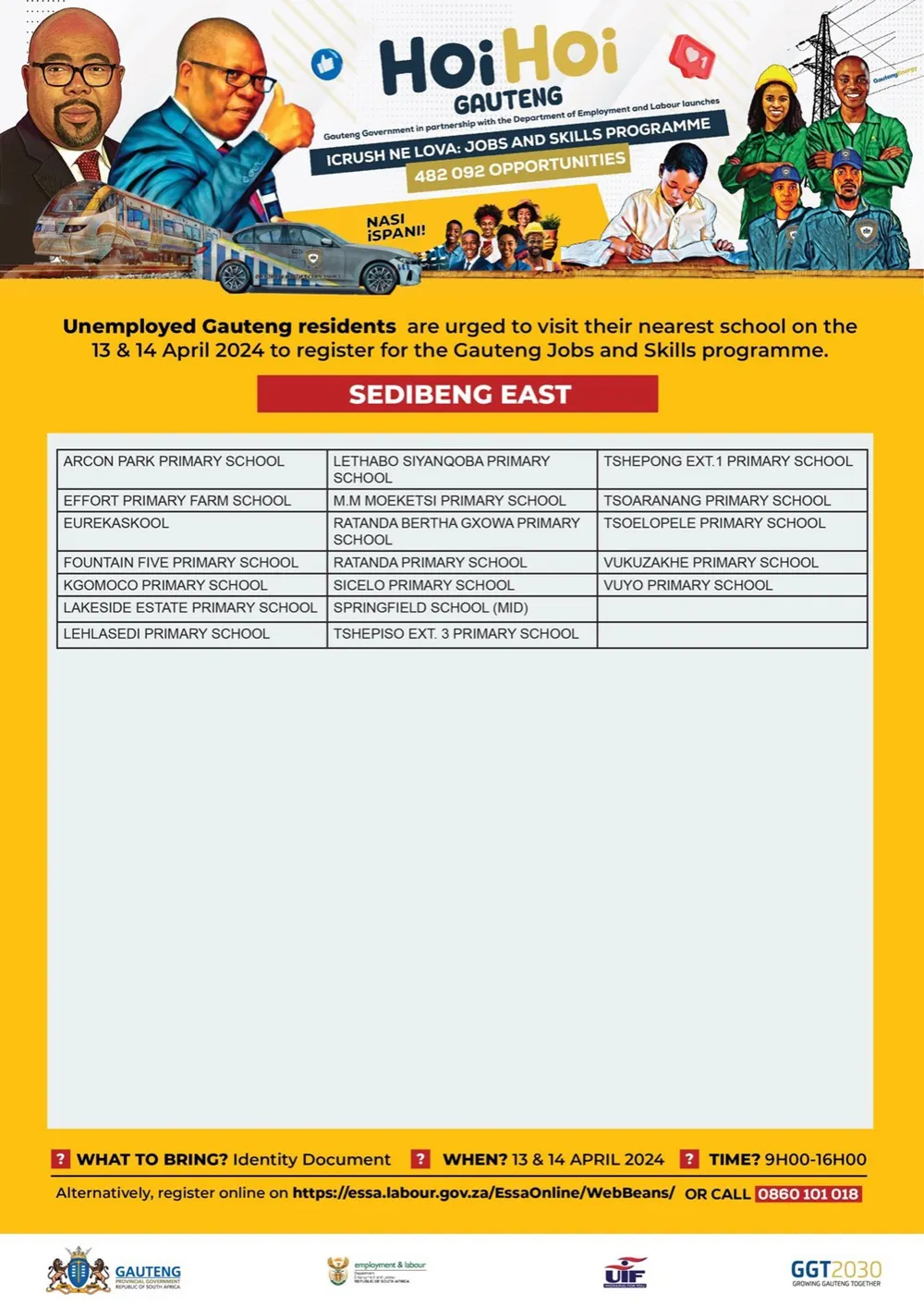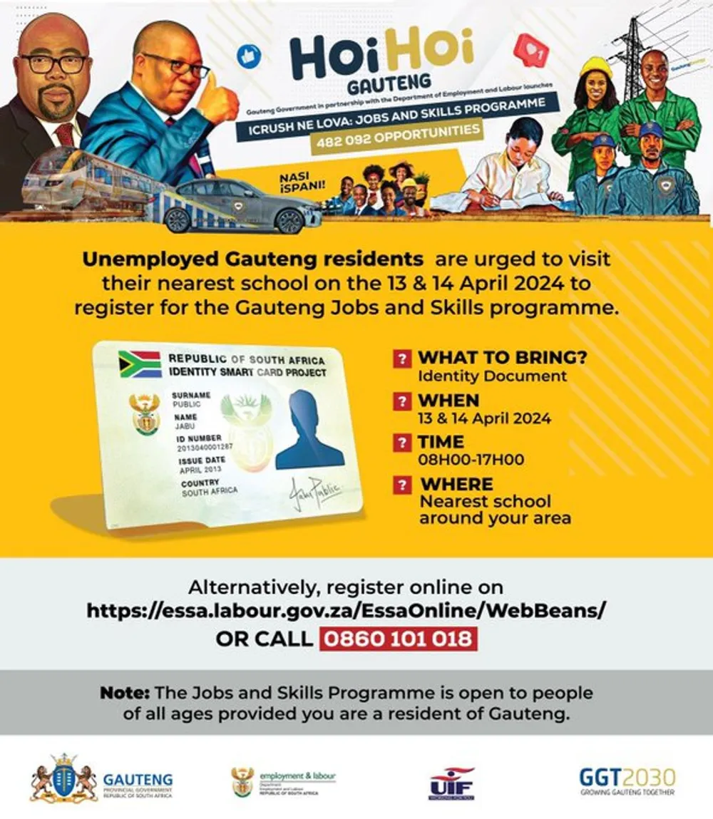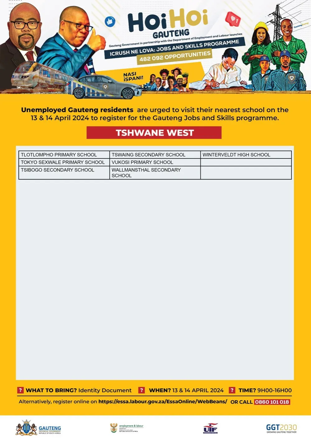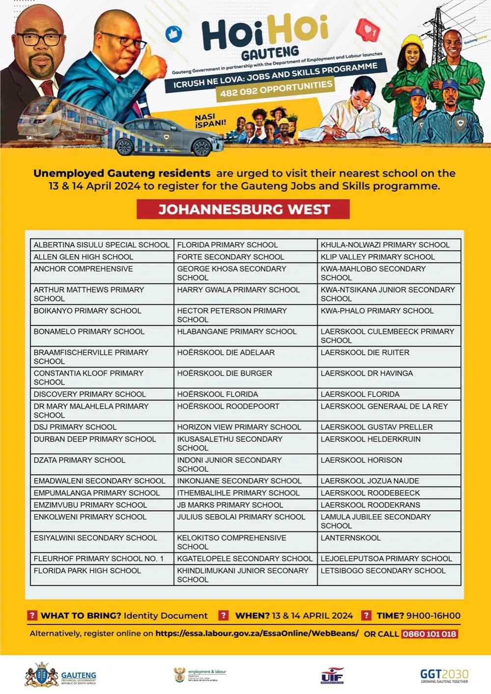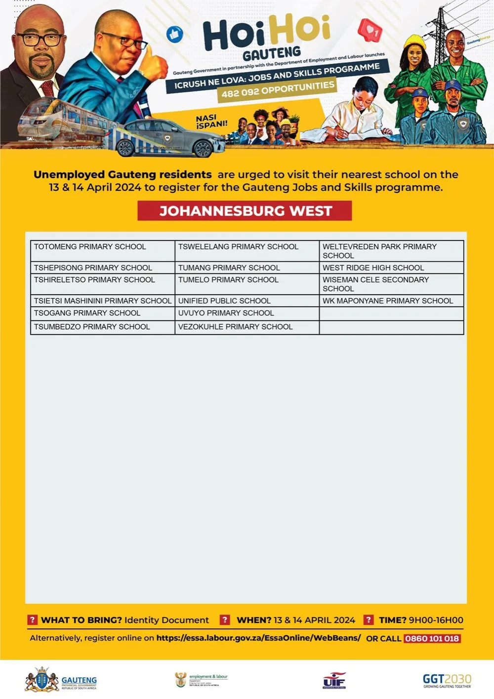 NgoLwesine ekuseni, uhulumeni saweGauteng ukhiphe isimemezelo sokuthi zonke izakhamuzi ezingasebenzi zinganikela ezikoleni ezehlukene ngokohlu olukhishiwe lapho bezobhalisela khona amathuba omsebenzi kanjalo namathuba okuqeqeshelwa amakhono ahlukahlukene ngale mpelasonto