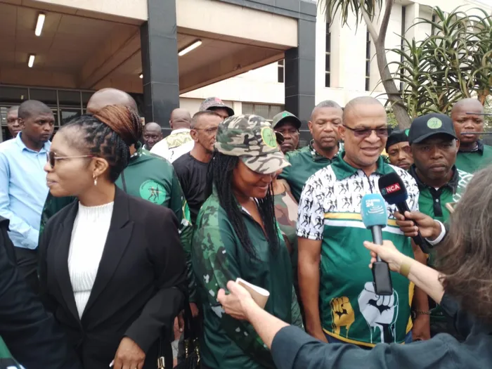 Owabhalisa ngokusemthethweni iMK, uMnuz Jabulani Khumalo, ekhuluma nabezindaba ngaphandle kweNkantolo eNkulu yaseThekwini Isithombe: Willem Phungula