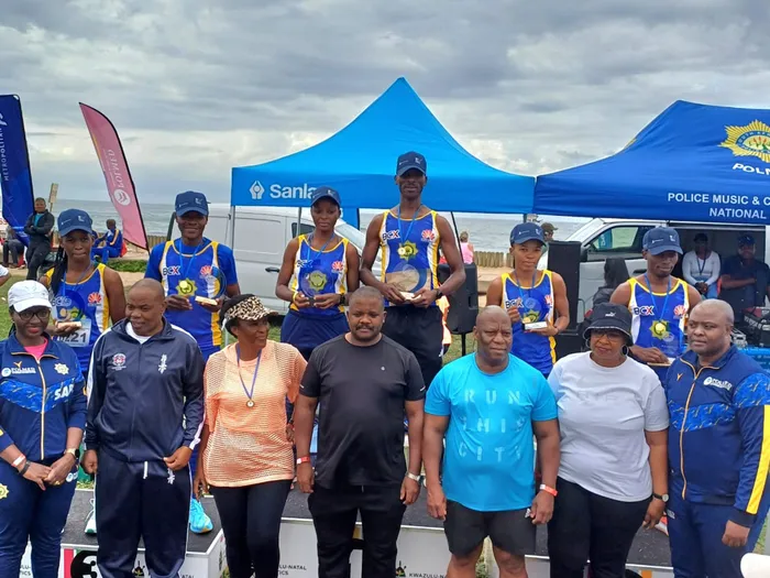 Kusukela kwesokunxele phambili: Ibamba likakhomishana esifundazweni uMaj Gen Phumelele Makoba, ekuqaleni kwesokudla phambili iphini likakhomishana uMaj Gen Dr Siyanda Ngcobo nezinye izikhulu zasesiphoyiseni zimi nabanqobile kulo mjaho. isithombe: sithunyelwe/SAPS