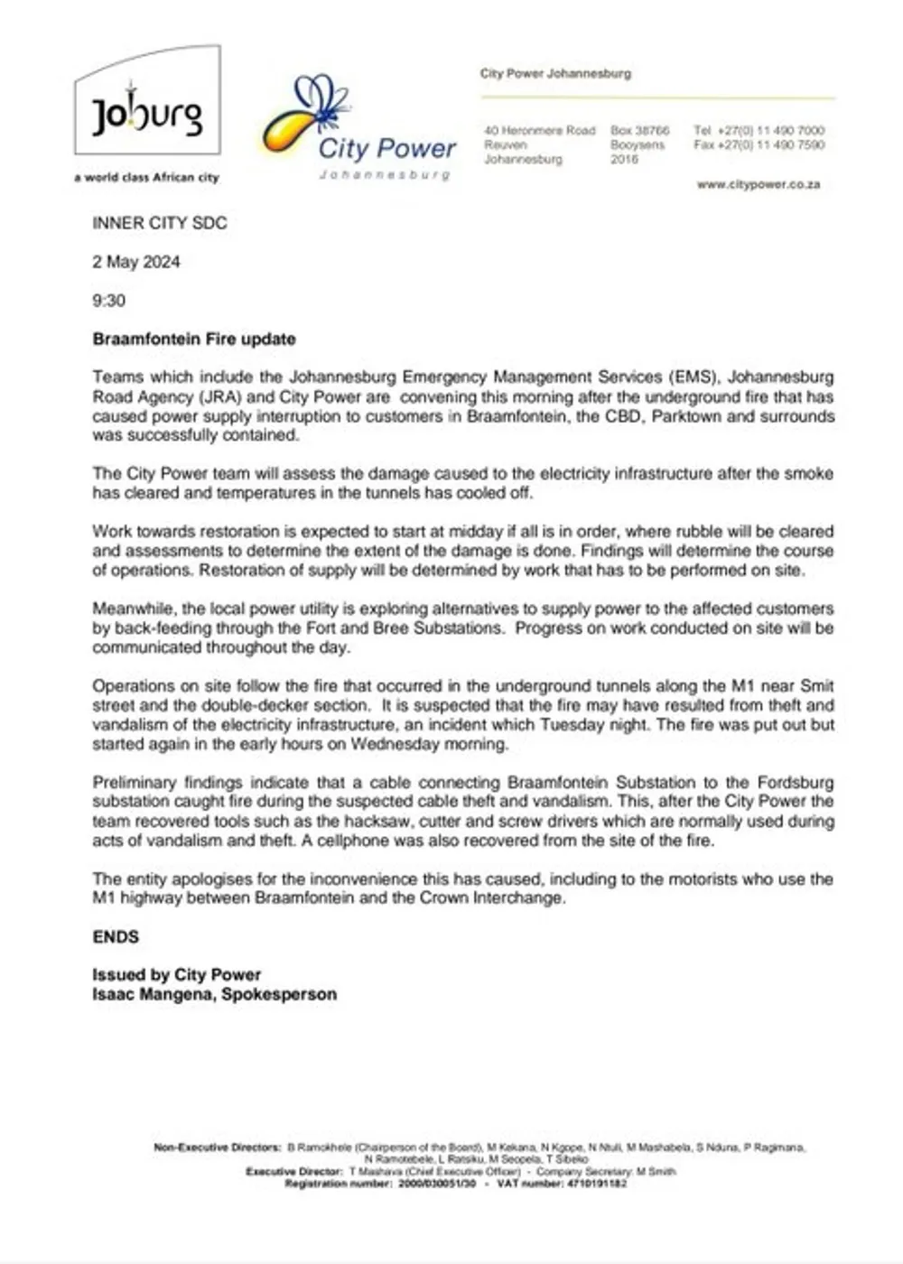 Kulindeleke ukuthi onjiniyela bezakhiwo bahlole isimo somhubhe okuhamba kuwo leli khebula elishe langqongqa eBraamfontein futhi bahlole nesimo sebhuloho kuM1 ngaphambi kokuba kungene nabanye ukuze kuqinisekiswe ezokuphepha.