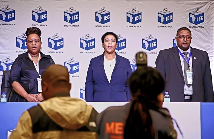 ISIKHULU se-IEC uNkk uNtombifuthi Masinga, uNdunankulu waKwaZulu - Natal uNkk Nomusa Dube -Ncube, noMnuz Glen Mashinini ngesikhathi kwethulwa isikhungo sokhetho e-ICC, eThekwini Isithombe: SIBONELO NGCOBO/INDEPENDENT MEDIA
