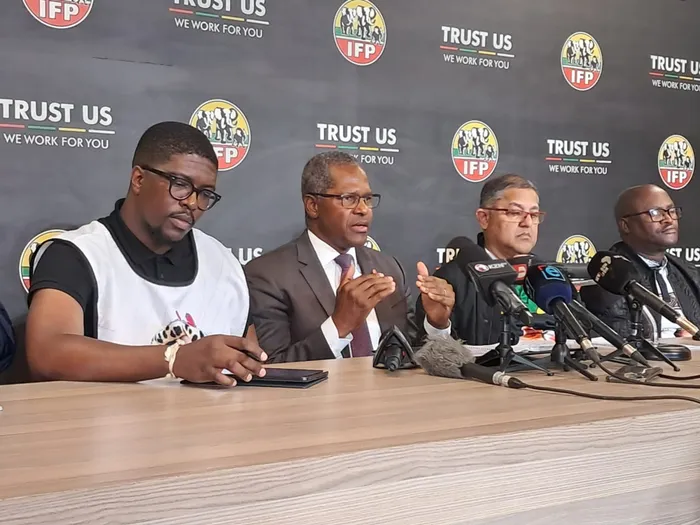 Umkhulumeli we-IFP uMnuz Mkhuleko Hlengwa, umengameli uMnuz Velenkosini Hlabisa, ilungu lephalamende le-IFP uMnuz Narend Singh nelungu lesishayamthetho uMnuz Nhlanhla Msimango ngesikhathi kunesithangami nabezindaba ngohulumeni wobumbano Isithombe: Nokubongwa Phenyane